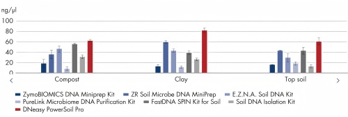 DNeasy PowerSoil Pro 试剂盒包括一种新型磁珠管和改进的裂解化学方法,与第一代 DNeasy PowerSoil 试剂盒和所有测试土壤类型中的竞争对手相比,分离出的DNA产量提高了 8 倍(图1)。