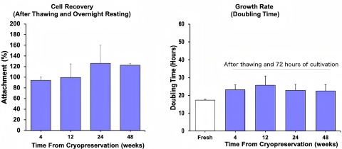 ADSC用SCB EX 一起冷冻保存 4、12、24 和 48 周。然后,我们评估解冻后过夜的细胞附着(细胞恢复;左图)和解冻和培养 72 小时后的细胞生长速率(倍增时间;右图)。结果表明,即使经过长期冷冻保存,细胞恢复和细胞生长速度也没有受到影响。