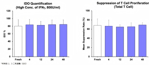 ADSC 与 SCB EX 一起冷冻保存 4、12、24 和 48 周。然后,我们评估了解冻后ADSC的细胞功能。结果表明,即使经过长期冷冻保存,在MSCs存在下IDO表达和T细胞增殖抑制率均不受影响。