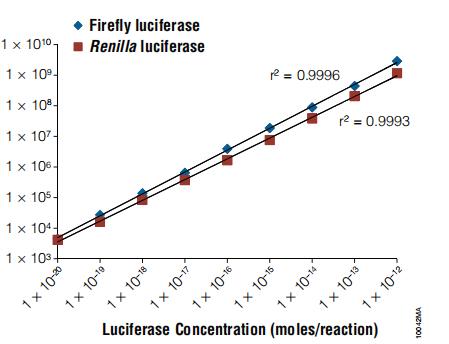 图3.萤火虫和海肾萤光素酶的线性范围比较。使用纯化的萤火虫和海肾萤光素酶混合物(用含有1mg/ml BSA的PLB制备)进行DLRT检测。使用Promega公司GloMax20/20发光检测仪测量发光信号。如图所示,使用DLRT检测系统,萤火虫萤光素酶检测的线性范围为8个数量级,且萤火虫萤光素酶报告基因酶的检测灵敏度≤0.1毫微微克(约为10²¹摩尔)。海肾萤光素酶检测的线性范围涵盖8个数量级,且可检测到约0.1毫微微克(约10²¹摩尔)的海肾萤光素酶。
