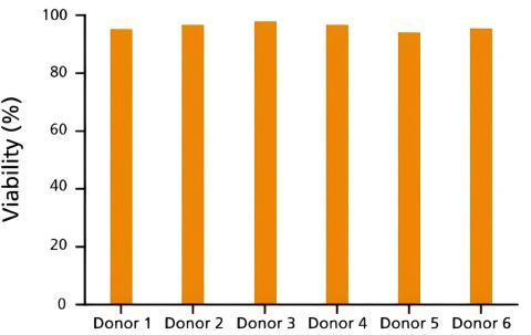 CryoStor®CS10能有效减轻温度诱导的细胞分子应激反应,从而******化多种免疫细胞(包括T细胞,数据未显示)和B细胞解冻后的存活率与回收率。如图所示,6名不同供体的人B细胞在CryoStor®CS10中冷冻保存后,经碘化丙啶染色检测显示解冻后存活率稳定保持高水平(94.3%-97.9%)。