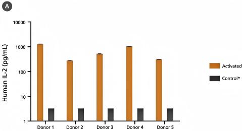(A) 将冷冻保存在CryoStor®CS10中的人外周血泛T细胞解冻后,在添加/不添加T细胞活化因子的条件下进行培养。供体1-3的细胞在含10%胎牛血清的RPMI培养基中培养24小时,实验组添加40 ng/mL PMA和1 μg/mL离子霉素(活化组),对照组不添加。供体4-5的细胞在ImmunoCult™-XF T细胞扩增培养基(货号#10981)中培养48小时,实验组添加ImmunoCult™人CD3/CD28 T细胞活化剂(货号#10971),对照组不添加。收集培养上清液后,使用人IL-2 ELISA试剂盒(货号#02006)测定分泌的细胞因子浓度。无论是PMA/离子霉素还是ImmunoCult™人CD3/CD28 T细胞活化剂的刺激,均能促使IL-2分泌量较未刺激的对照组显著增加。