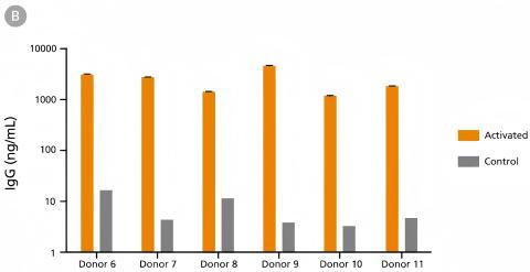 (B) 将冷冻保存在CryoStor®CS10中的人B细胞(供体6-11)解冻后,用1 µg/mL CD40和100 ng/mL IL-21刺激培养7天。收集培养上清液,使用人IgG ELISA抗体配对试剂盒(货号#01994)检测免疫球蛋白G(IgG)的分泌量。与未刺激的对照组相比,B细胞活化显著提高了IgG的分泌水平。