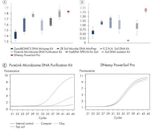 DNeasy PowerSoil Pro 试剂盒包括一种新型磁珠管和改进的裂解化学方法,与第一代 DNeasy PowerSoil 试剂盒和所有测试土壤类型中的竞争对手相比,分离出的DNA产量提高了 8 倍(图1)。