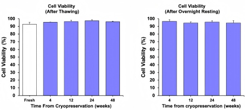 ADSC用SCB EX 一起冷冻保存 4、12、24 和 48 周。解冻后立即评估细胞活力(左图)和解冻后过夜(右图)。用 SCB EX 冷冻保存的细胞即使在长期冷冻保存后也显示出高活力,即使在过夜休息后也保持高活力。.jpg)